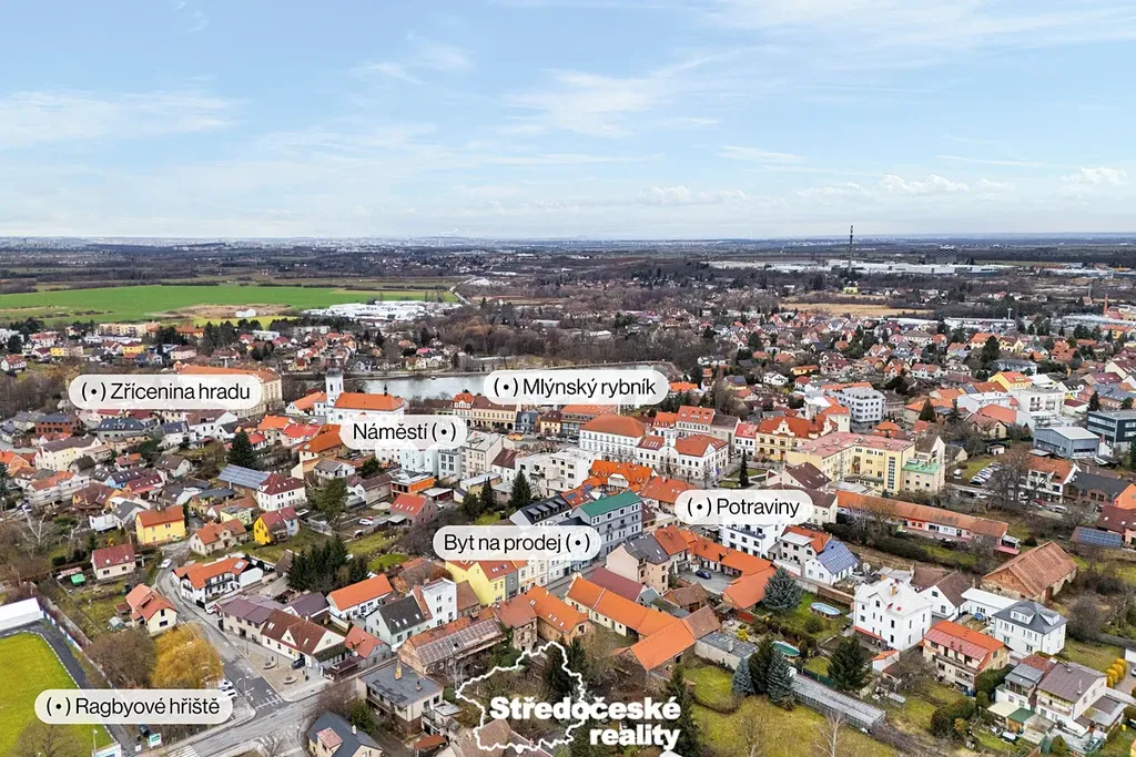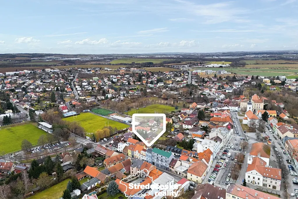 Výborná lokalita v centru města s kompletní občanskou vybaveností a skvělou dopravní dostupností do Prahy (vlak cca 30 minut, autem cca 20–25 minut).