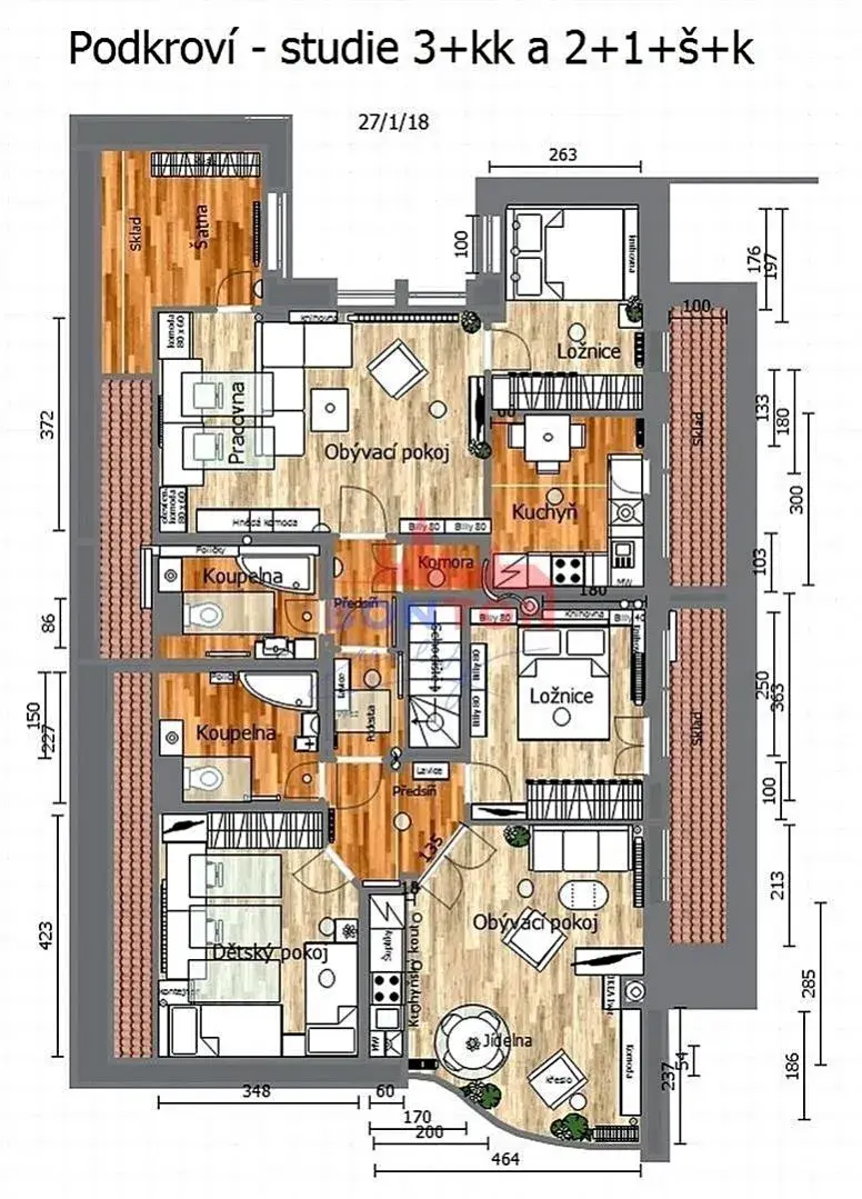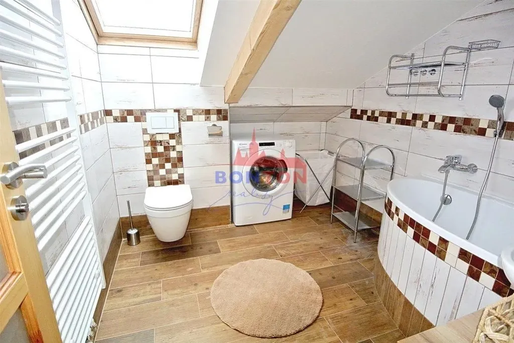 Ve výhradním zastoupení nabízíme česky nebo slovensky mluvícím zájemcům pronájem krásného slunného atypického podkrovního bytu 3+kk, orientovaného na jih s nádherným výhledem do zahrady i na oboru s ovečkami, a situovaného v podkroví rodinného domu ve vyhledávané lokalitě Prahy 4 Šeberov. Byt o obytné ploše 58 m2 má vlastní vchod, veškeré IS a je nadstandardně vybavený. Dispozice: malá hala (4,46 m2) se samostatnými vstupy do ložnice (11,01 m2), do pokoje (14,2 m2), do koupelny (5,98 m2) a do obývacího pokoje s kuchyňským koutem (21,72 m2). Z vybavení: dřevěné dubové podlahy (olejovosk) a dlažby, dveře z borovicového masivu, dřevěná sklopně výklopná střešní okna ROTO s roletkami, protisluneční fólie na oknech v ložnici, kuchyňská linka s kombinovanou lednicí s mrazákem, vest. el. troubou, indukční varnou deskou, myčkou, výsuvnou digestoří, mikrovlnnou troubou aj., sedačka, dva designové konferenční stolky z ohýbané břízy, komoda a TV stolek masiv, stůl (sklo, nerez) se 4 židlemi (ohýbané dřevo, nerez), kompletně zařízená ložnice s vest. zrcadlovou skříní, manželskou postelí s úložným prostorem, skříňky, úložný prostor v šikmině o ploše 6 m2, velká atypická eurookna s obousměrnými žaluziemi bambus plisé (v ostatních oknech jsou žaluzie v dekoru dřeva), pokoj je vybaven skříní na míru z borovicového masivu, v koupelně je vana, umyvadlo se skříňkou, WC geberit, automatická pračka se sušičkou, poličky a drátěný program, předsíň je vybavena botníkem, věšáky apod. Možnost využívání střešní terasy. Parkování před domem nebo za poplatek za branou na soukromém parkovišti. Příjemné a klidné prostředí v nové vilové zástavbě s výbornou dopravní dostupností (1 stanice autobusem na metro C Opatov) poblíž přírodní rezervace hrnčířských luk a rybníků. V inzerované ceně (platí pro 1 osobu, za 2. a další osobu +2.000,- Kč) nejsou zahrnuty poplatky, které činí cca 8.000,- Kč vč. elektřiny a připojení k internetu. Provize RK 35.000,- Kč, skládá se vratná kauce. Volné od 1.5.2026. Pronájem je vhodný pro nekuřáky, bez domácích mazlíčků. Bližší informace u makléře.