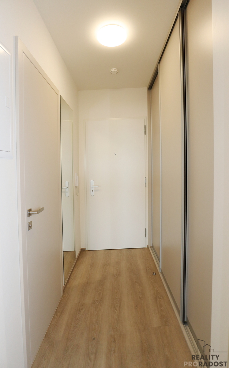 Jednotka se nachází v 6. podlaží novostavby s výtahem a sestává ze vstupní předsíně, ve které je umístěna šatní skříň vyrobená na míru, dále sestává z obytného pokoje s kuchyňským koutem, koupelny se sprchovým koutem a wc. K bytu patří sklepní kóje 4,5m2 a jedno parkovací stání v suterénu domu.