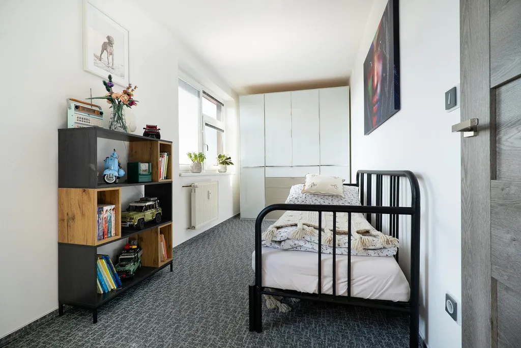 K bytu náleží kryté parkovací stání a sklep ve 4. nadzemním podlaží, který je díky střešnímu oknu příjemně prosvětlený, a nabízí tak ideální prostor nejen pro uskladnění věcí, ale i pro využití jako pracovna či menší kancelář.