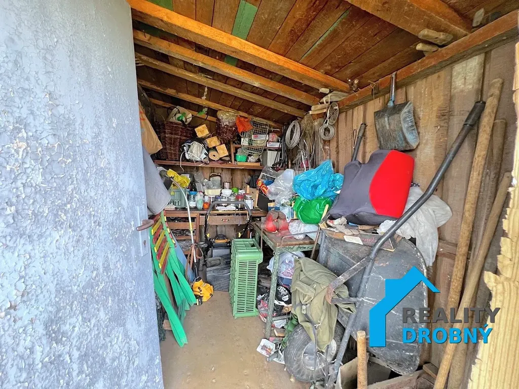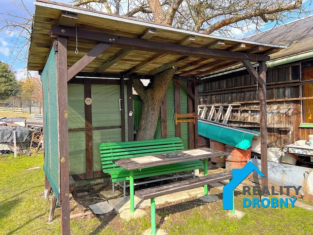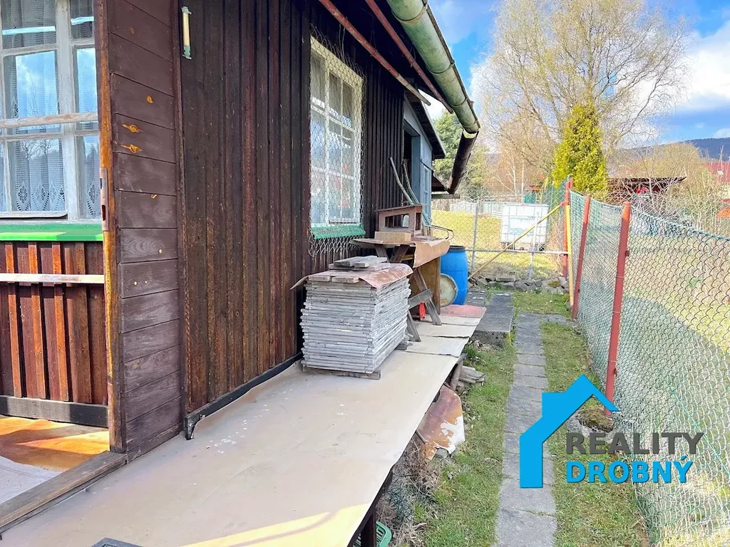 Pozemek je mírně svažitý. Součástí pozemku je dřevěná chata a přístřešek. Střecha je z asfaltových plátů. K dispozici jsou záhony, nádoby na dešťovou vodu, suchý záchod s jímkou.