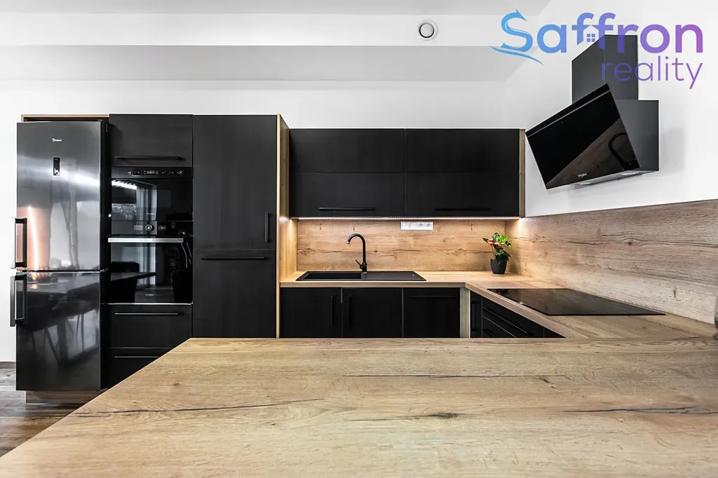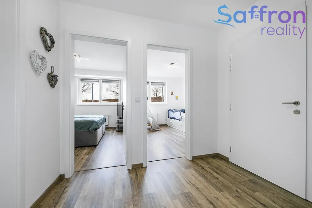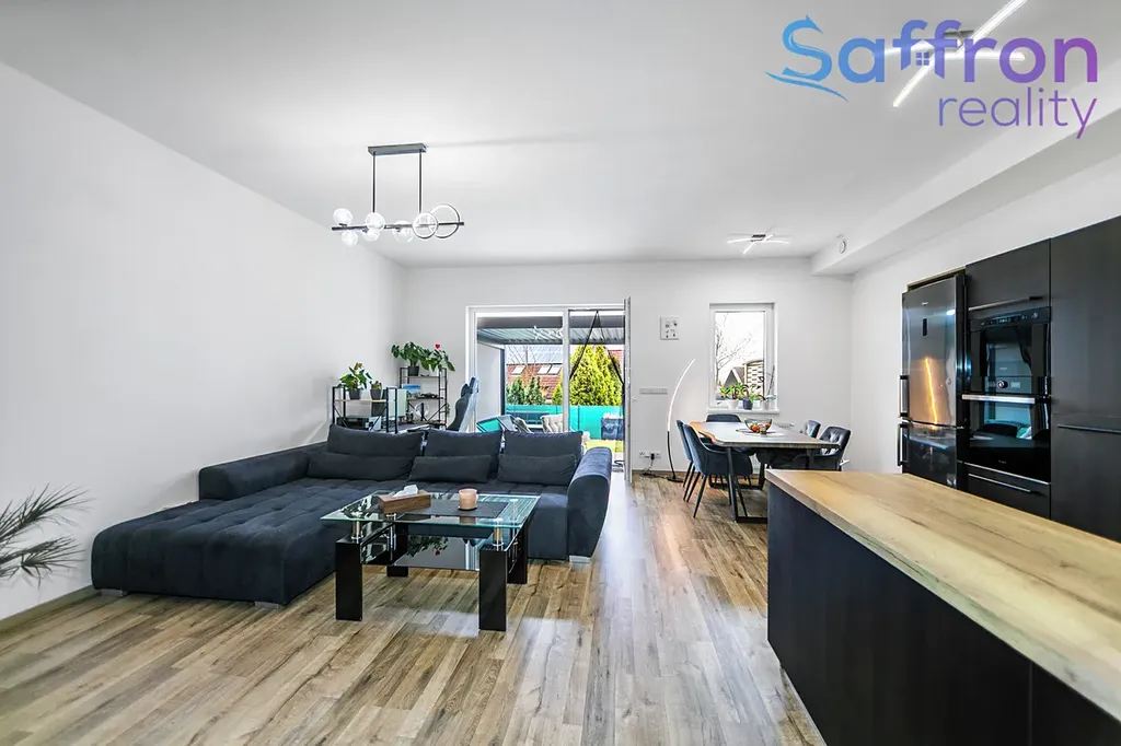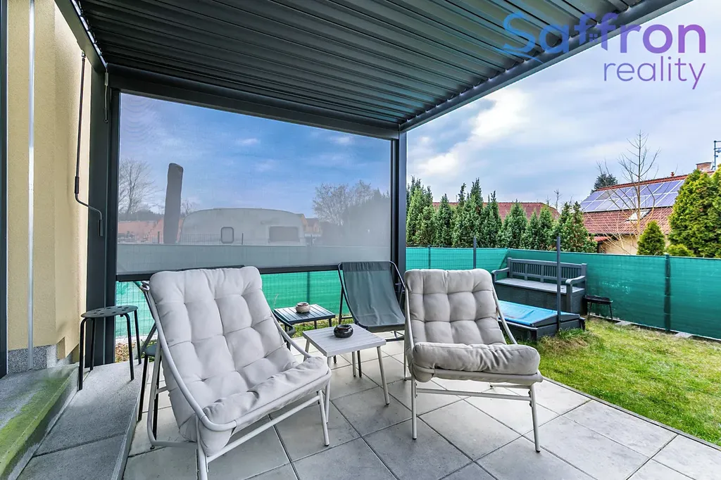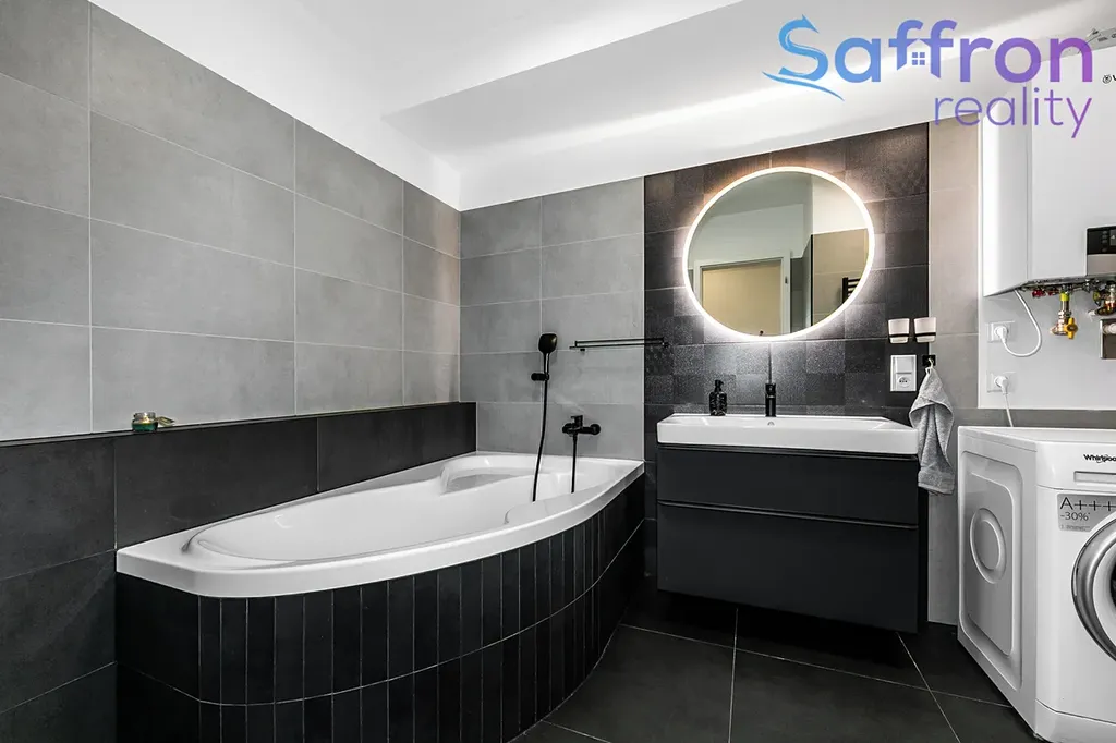 Byt se nachází v novostavbě a nabízí komfortní, moderní bydlení s důrazem na kvalitu a praktičnost. Dominantou je prostorný obývací pokoj s kuchyňským koutem v elegantním designu, kde se snoubí tmavé prvky s dekorem dřeva a vytváří nadčasový a útulný interiér. Velkoformátová francouzská okna zajišťují dostatek denního světla a umožňují přímý vstup na soukromou zahrádku, která je ideálním místem pro relaxaci, posezení s rodinou či přáteli, ale také například pro pěstování vlastní zeleniny ve vyvýšených záhonech.