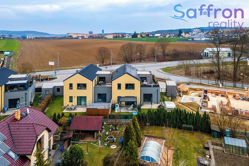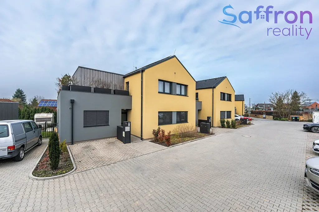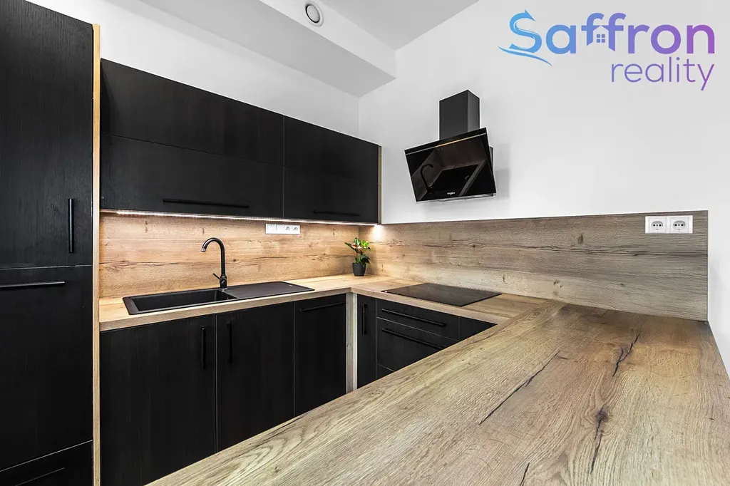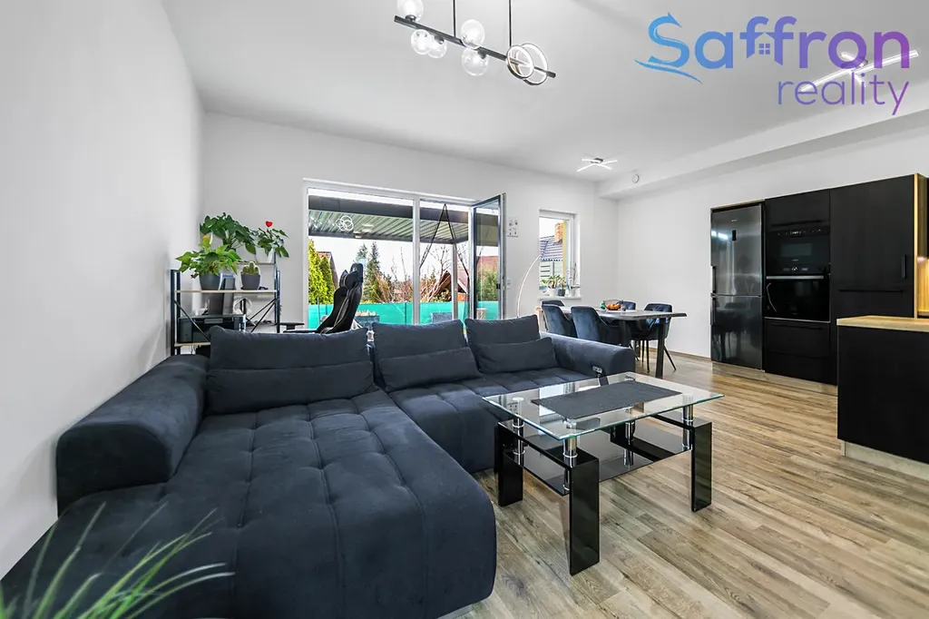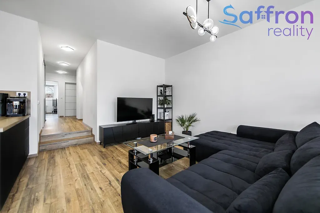 Byt se nachází v novostavbě a nabízí komfortní, moderní bydlení s důrazem na kvalitu a praktičnost. Dominantou je prostorný obývací pokoj s kuchyňským koutem v elegantním designu, kde se snoubí tmavé prvky s dekorem dřeva a vytváří nadčasový a útulný interiér. Velkoformátová francouzská okna zajišťují dostatek denního světla a umožňují přímý vstup na soukromou zahrádku, která je ideálním místem pro relaxaci, posezení s rodinou či přáteli, ale také například pro pěstování vlastní zeleniny ve vyvýšených záhonech.