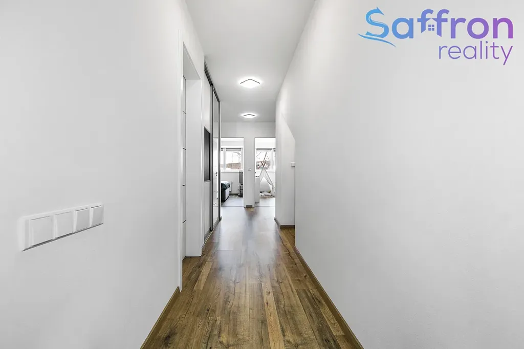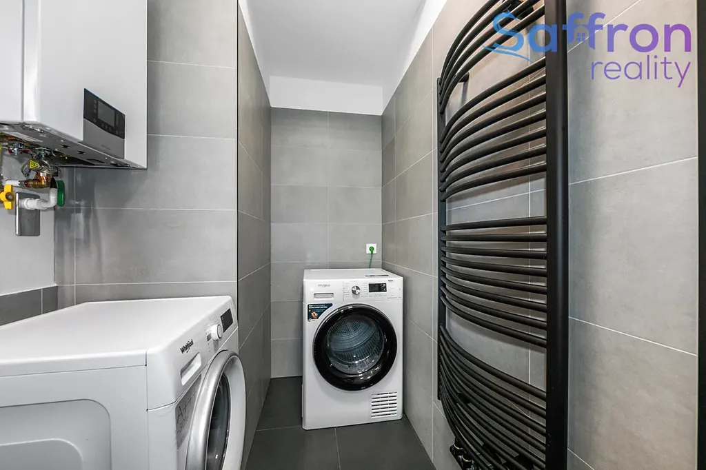 Dispozice bytu je velmi praktická a promyšlená. Kromě hlavního obytného prostoru zde najdete samostatnou ložnici a další pokoj, který může sloužit jako dětský pokoj, pracovna nebo pokoj pro hosty. Koupelna je řešena moderně s vanou, designovým osvětlením a dostatkem prostoru pro pračku i sušičku. Výhodou je také samostatná technická místnost, která poskytuje další úložný prostor a zvyšuje celkový komfort bydlení.