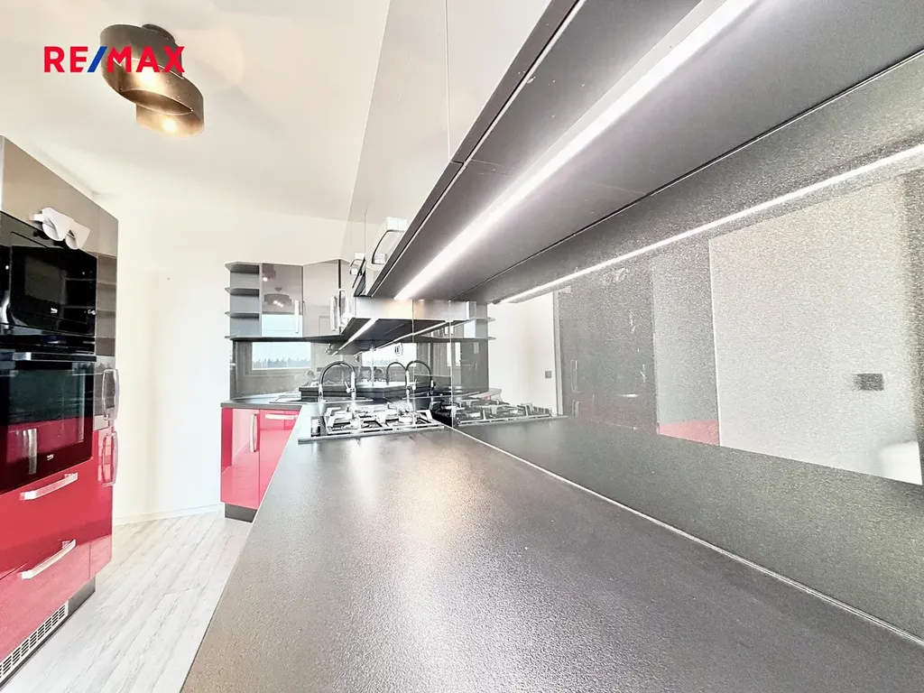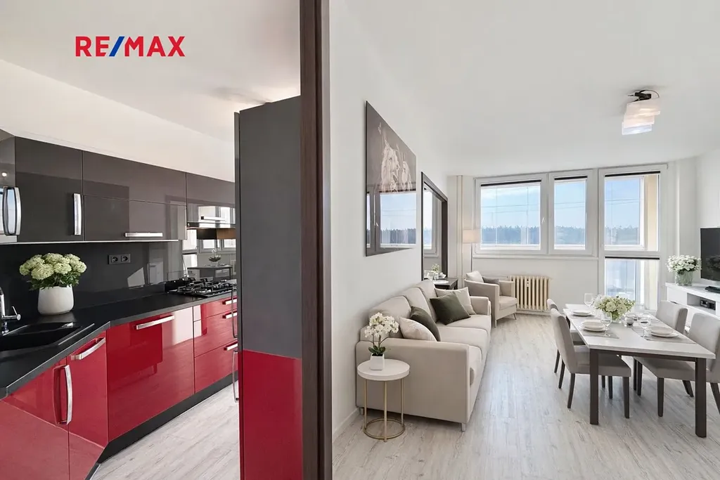 Výhodou je zasklená lodžie s krásným výhledem vysoko nad vilovou čtvrť a v dálce na les.