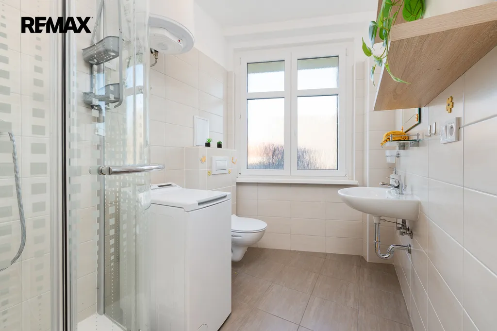 - Z obývacího pokoje je vstup do koupelny se sprchovým koutem a toaletou