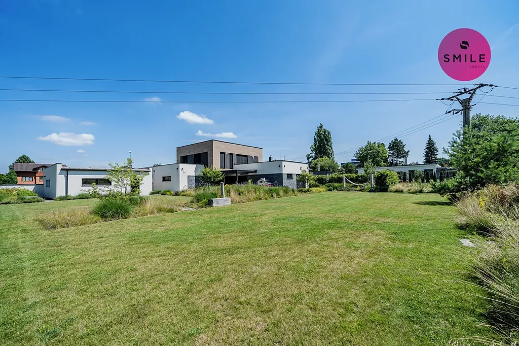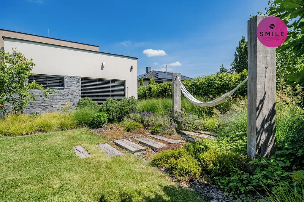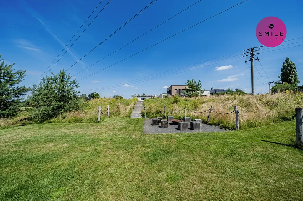 Pozemek je řešen s důrazem na pohodlí, soukromí i estetiku. Vstup na pozemek zajišťuje elektrická pojezdová brána, instalován elektronický zabezpečovací systém Jablotron, pohybová čidla a venkovní kamery. Pro chvíle odpočinku i setkávání s rodinou a přáteli je k dispozici elegantní bioklimatická pergola zn. Renson a pečlivě upravená zahrada realizována firmou Lampart & Mec. Nechybí vyvýšené záhony, odpočinková místa, prostor pro grilování či opékání, dětské pískoviště.