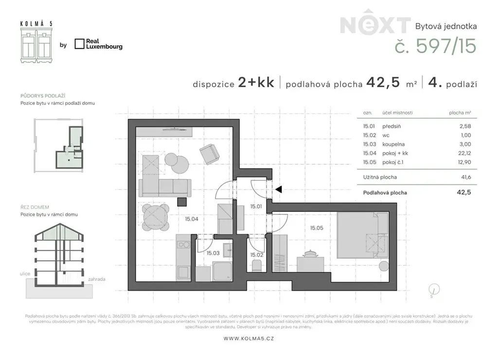 Tato konkrétní jednotka č.15 o dispozici 2kk a podlahové ploše 43 m2 se nachází ve 4 nadzemním podlaží s výhledem jak do ulice, tak do zahrady. Je členěna na vstupní chodbu, samostatnou toaletu, obývací pokoj s kuchyňským koutem, ze kterého je přístup do koupelny a oddělenou ložnici. Přesné rozložení si můžete prohlédnout na přiloženém půdorysu.