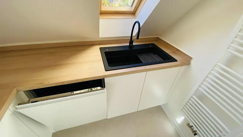 Byt je vybaven velkou komplet novou kuchyní - kuch.linkou na míru s mnoha úložnými prostorami, s ostrůvkovým vařením s vestavěnými spotřebiči Whirlpool (indukční varná deska, samostatná elektrická trouba, mikrovlnka, myčka na nádobí, velká lednice s mrazákem), ostrůvková stropní digestoř Klarstein, dřez s baterií Alveus.