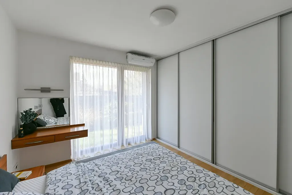 Hlavní ložnice nabízí maximální komfort díky manželské posteli, vestavěným skříním a vlastní klimatizaci. Druhý pokoj je aktuálně využíván jako pracovna a poskytuje flexibilní využití dle potřeb nájemce. Z obou pokojů je zajištěn přímý vstup na zahradu, což umocňuje pocit propojení interiéru s exteriérem.