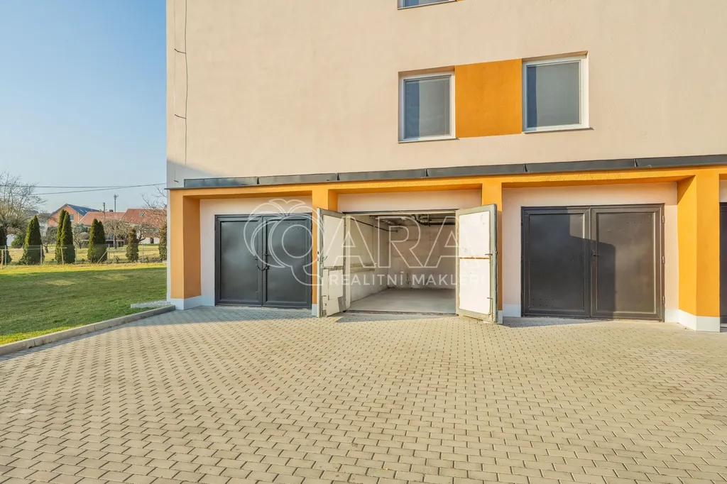 Společně s bytem je také možnost dokoupit za 400.000,- Kč zděnou, uzavíratelnou garáž o velikosti 20 m² umístěnou v přízemí domu (není ale podmínkou), jinak lze parkovat bez problému na ulici.