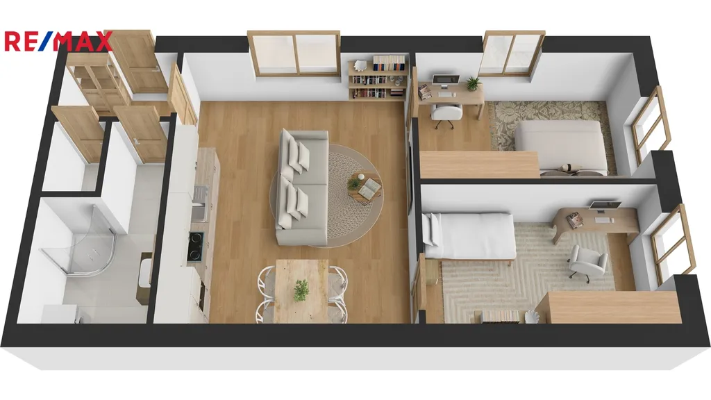 Dispozice bytu je prakticky řešená a nabízí vstupní chodbu, dva samostatné pokoje vhodné jako ložnice, obývací pokoj s kuchyňským koutem a prostorem pro jídelnu, samostatnou toaletu a koupelnu se sprchovým koutem. Součástí koupelny je také pračka, zrcadlová skříňka a umyvadlová skříňka. Kuchyňská linka je nová a vybavena elektrickou troubou, sklokeramickou varnou deskou, myčkou nádobí a volně stojící lednicí.