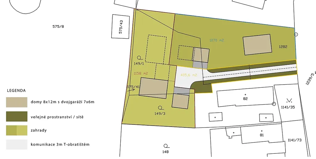 Pozemek je dle územního plánu určen k zastavění stavbou rodinného domu s maximálně dvěma nadzemními podlažími + podkroví. Vzhledem k jeho celkové ploše se nabízí i rozdělení na dvě stavební parcely, jehož možné řešení vám také nabízíme.