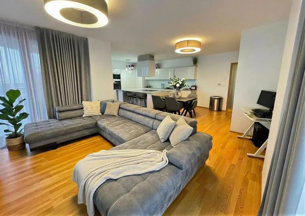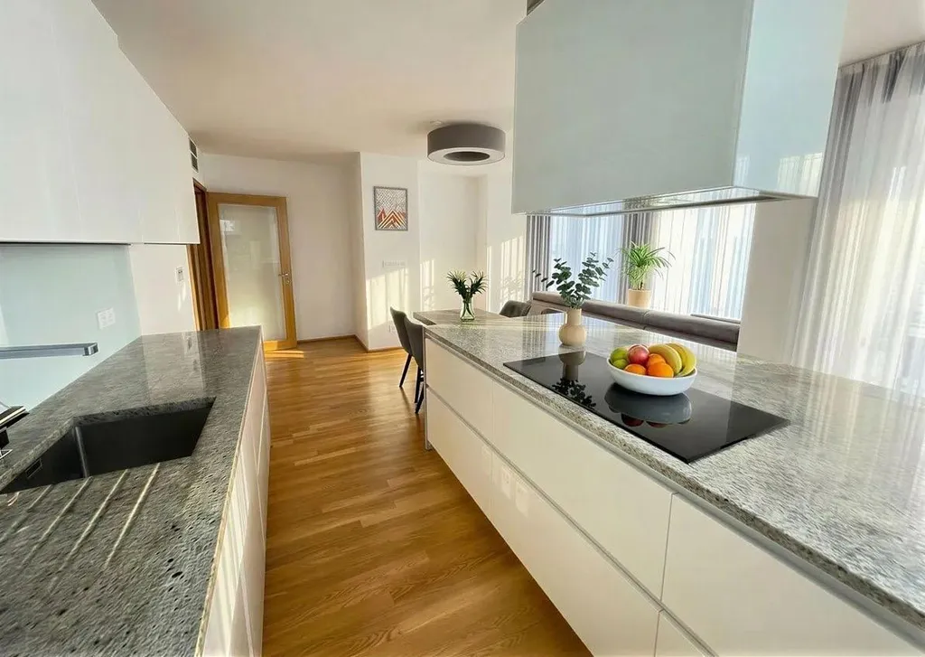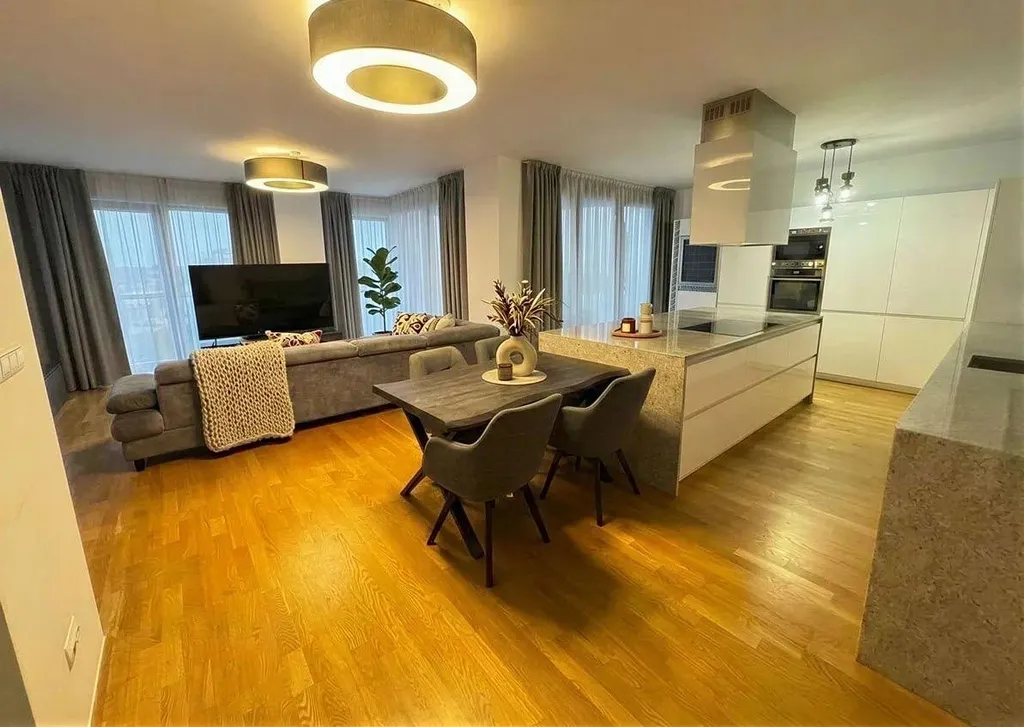 Tato nadstandardní nemovitost je kompletně zařízená s důrazem na detail a připravena k okamžitému nastěhování. Dominantou bytu je světlý a vzdušný obývací prostor s plně vybaveným kuchyňským koutem, jídelní částí, designovou sedací soupravou a TV. Kuchyň disponuje všemi vestavěnými spotřebiči (varná deska, trouba, myčka, lednice, mikrovlnná trouba).