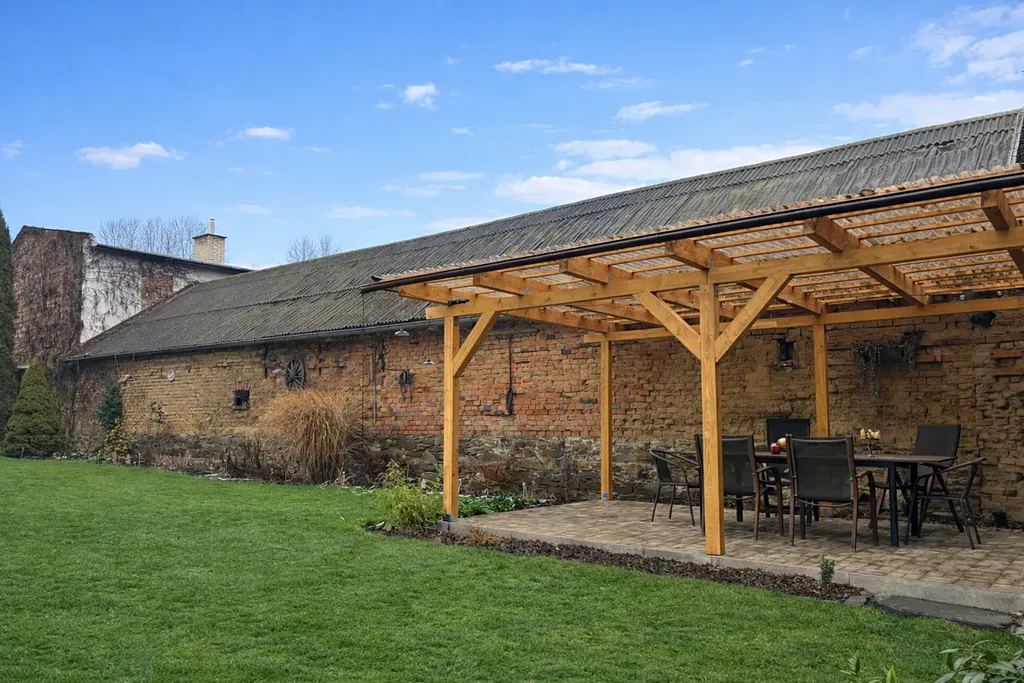 Součástí je bývalý vejminek, ve kterém je vybudována letní kuchyň a další místnost využívaná jako kancelář, vhodná například pro home office nebo podnikání (aktuálně není na fotografiích).