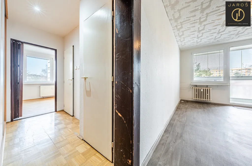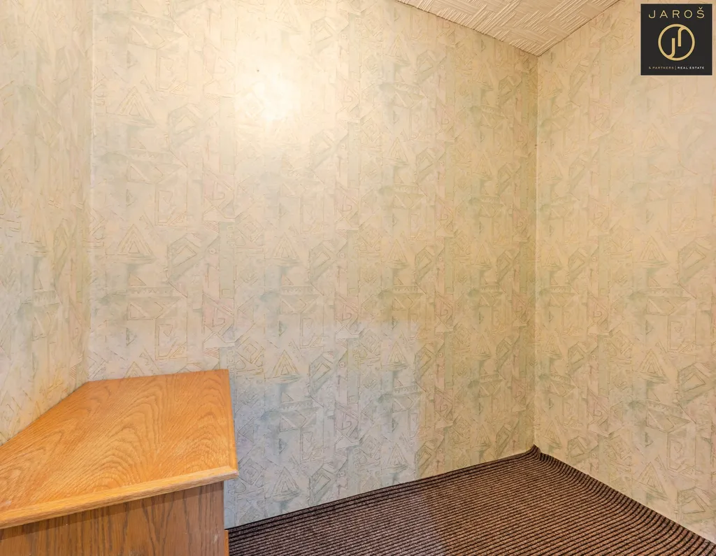 Byt se nachází ve 3. patře pečlivě udržovaného domu s výtahem a hned po vstupu vás překvapí svou vzdušností. Dominantou je prostorný obývací pokoj, do kterého se díky velkým oknům doslova vylévá denní světlo. Na něj navazuje moderní kuchyňský kout v dekoru dřeva, který je ve špičkovém stavu a plně vybaven vestavnými spotřebiči (myčka, trouba, mikrovlnka). Milovníci pořádku ocení bonusovou místnost s kobercem, která je jako stvořená pro šatnu snů nebo klidný home office.