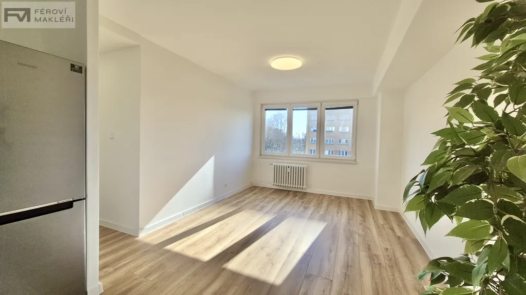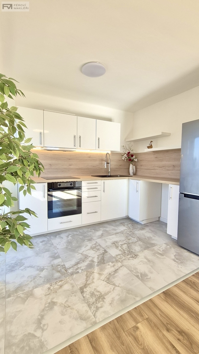Byt je po kompletní rekonstrukci a září novotou. Obývací pokoj propojený s kuchyní nabízí velmi vzdušný a příjemný prostor, celodenně prosvětlený, ale nepřehřívaný. V kuchyni je indukční varná deska a horkovzdušná pečící trouba, vše kvalitní značka GORENJE, lednice Samsung, příprava na pračku.