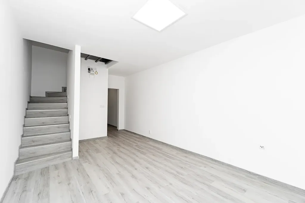 Byt je rozdělen do dvou úrovní. Po vstupu do bytu se ocitnete v útulné kuchyni, která je vybavena elektrickou indukční varnou deskou, vestavěnou elektrickou troubou a mikrovlnnou troubou. Disponuje také kuchyňským ostrůvkem, díky němu má kuchyň moderní vzhled a dostatek úložného místa. Kuchyň má také přípojky na myčku a pračku, což usnadňuje běžný provoz domácnosti. Ve spodní části bytu se nachází prostorný a slunný obývací pokoj, ideální pro odpočinek a rodinné posezení, a toaleta.