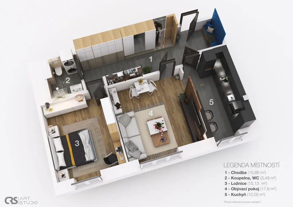 Interiér je řešen v moderním a nadčasovém stylu. Po vstupu do bytu se ocitnete v prostorné předsíni, z které se vchází do ostatních prostor. Kuchyň se nachází proti vstupním dveřím a je vybavena moderní kuchyňskou linkou v šedém provedení, samozřejmostí jsou vestavěné spotřebiče. Z kuchyně se vstupuje do obývacího pokoje, vstup je možný i z předsíně. Obývací pokoj nabízí dostatek prostoru pro sedací soupravu, obývací stěnu i jídelní stůl. V zadní části bytu je ložnice, do které se pohodlně vejde velká postel i další vybaveni podle potřeb nového majitele. Koupelna je prostorná, se sprchovým koutem a místem pro pračku a sušičku. Toaleta je součástí koupelny. Celý byt je vybaven dveřmi značky Sapeli a moderními žaluziemi. V ložnici a obývacím pokoji jsou vinylové podlahy, v ostatních prostorách je dlažba. Orientace bytu je na východ. K bytu náleží prostorná sklepní kóje, vhodná pro sportovní vybavení a sezónní věci.