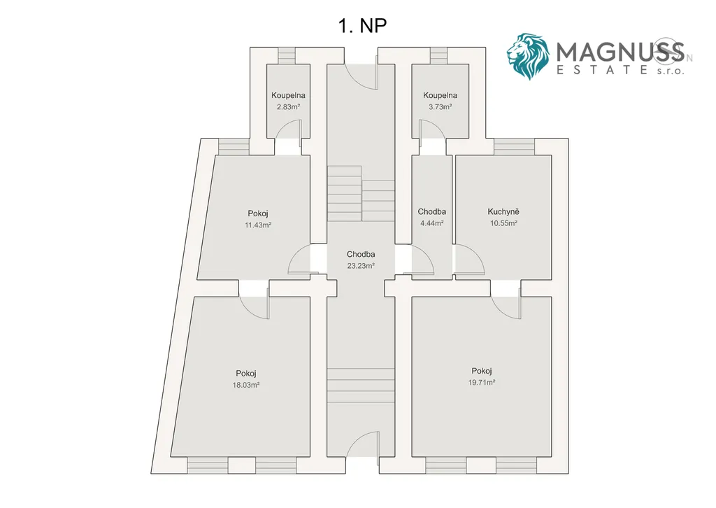 V 1. nadzemním podlaží (celková plocha cca 95 m²) se nachází dvě jednotky o dispozici 1+1, každá s podlahovou plochou přibližně 39 m². Obě mají vlastní vstupní chodbu a sociální zázemí a jsou připraveny k rekonstrukci dle představ nového majitele.