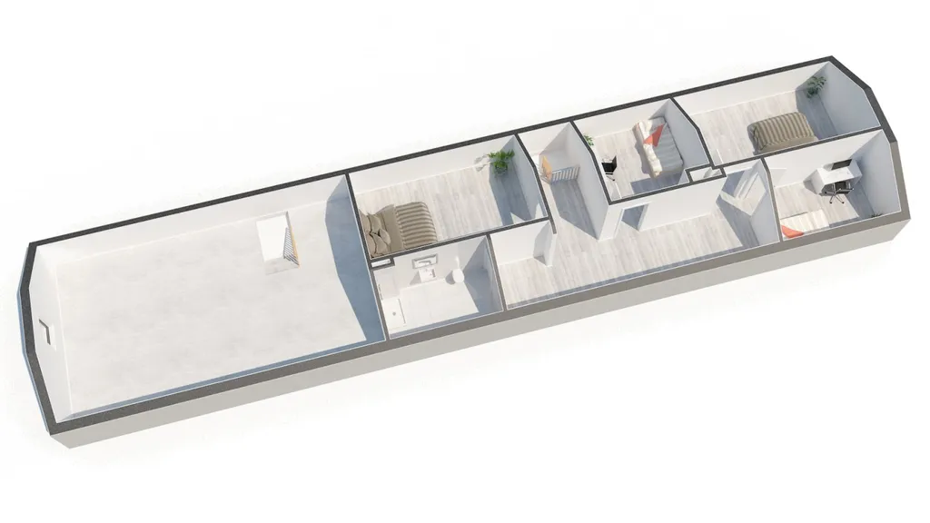 Do domu se vstupuje z uzavřeného dvora do předsíně, odkud pokračujete dále chodbou. Z chodby vede dřevěné schodiště do obytného podkroví. V přízemí se nachází kuchyně, samostatná jídelna, obývací pokoj, ložnice, koupelna s toaletou a druhý vstup, který vede přímo na zahradu.