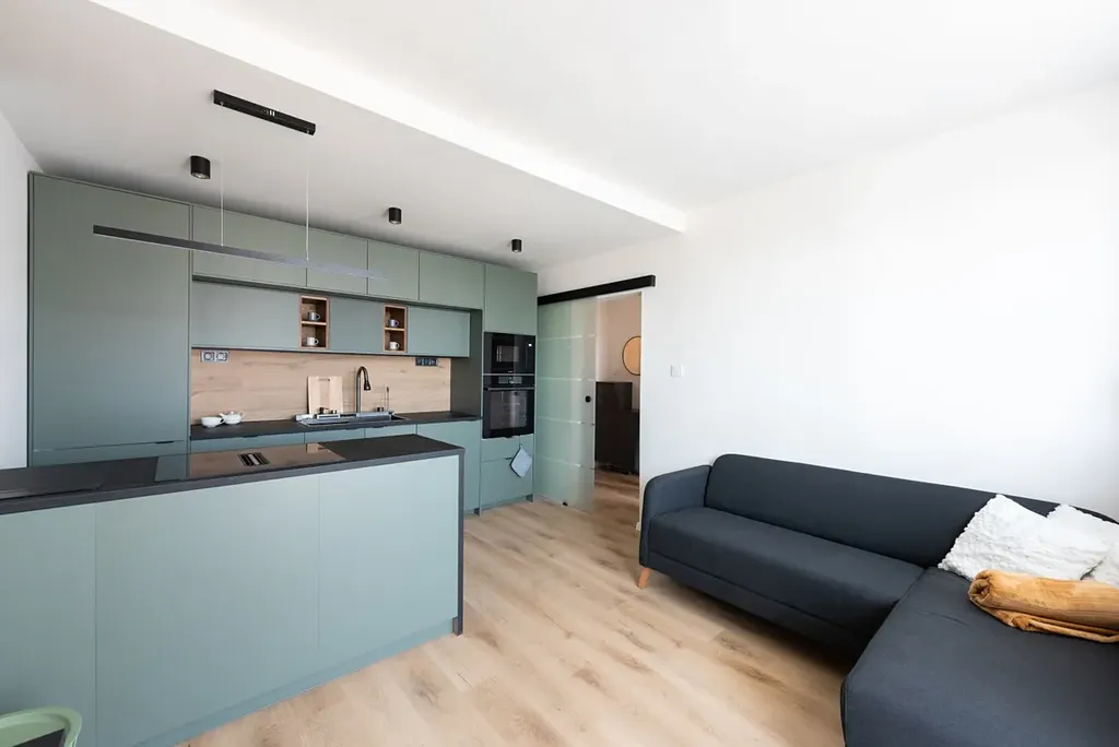 Vnitřní uspořádání - vstupní chodba (2,9m2) s úložnými prostory, samostatná neprůchozí ložnice (10,5m2) s velkou vestavěnou skříní, světlý obývací pokoj (15,6m2) napojený na kuchyňský kout, kde je k dispozici zánovní kuchyňská linka, která poskytuje dostatek pracovní plochy, úložných prostor a je plně vybavena vestavnými spotřebiči (pračka se sušičkou, myčka, lednice s mrazákem, horkovzdušná trouba, mikrovlnná trouba, sklokeramická deska). Moderní koupelna (2,9m2) v nadčasovém designu je vybavena dostatečně prostorným sprchovým koutem a wc.