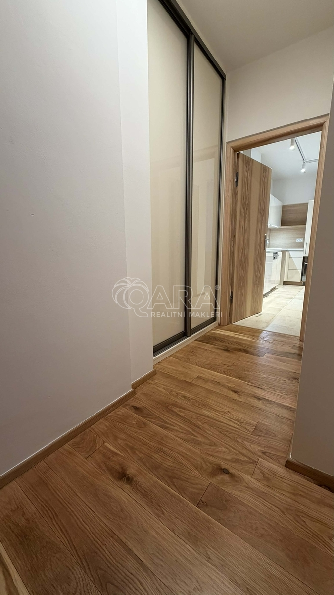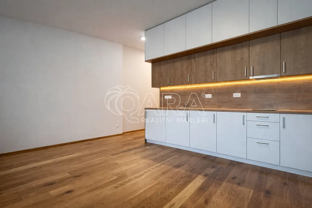 Interiér nabízí kvalitní materiály, jako jsou dřevěné podlahy a velkoformátová dlažba. Byt je vybaven moderní kuchyňskou linkou, obývací částí, koupelnou s vanou, toaletou a vstupní chodbou s úložným prostorem.
