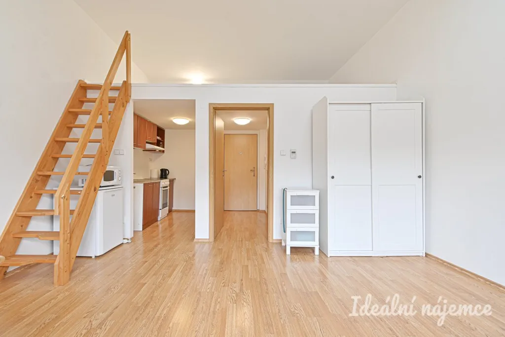 Dispozice 1+kk nabízí prakticky řešený obytný prostor s šikovně odděleným kuchyňským koutem a vyvýšenou ložnicí. Koupelna je zařízena sprchovým koutem, umyvadlem a toaletou.