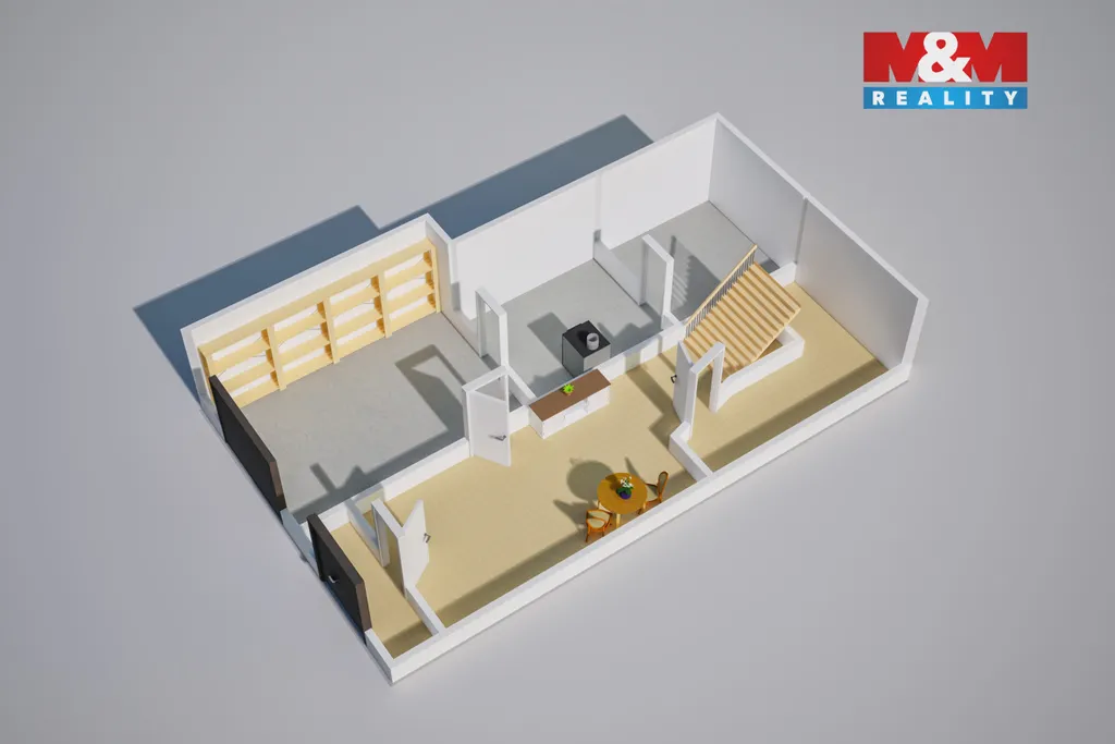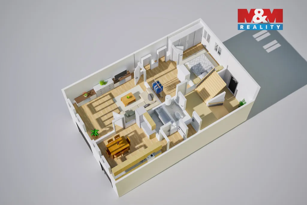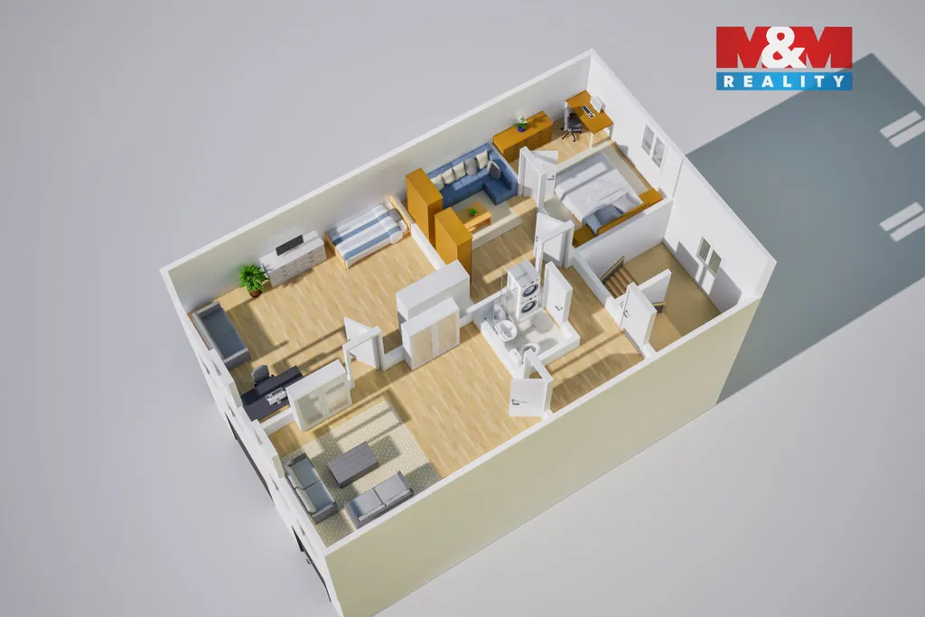 V prvním poschodí je byt o dispozici 2+1 s další místností bez okna sloužící jako šatna a koupelna a WC.