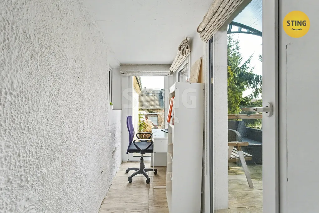 1. patro: Dva světlé pokoje, pracovna (ideální jako home office), druhá koupelna s WC a velký balkon s výhledem.