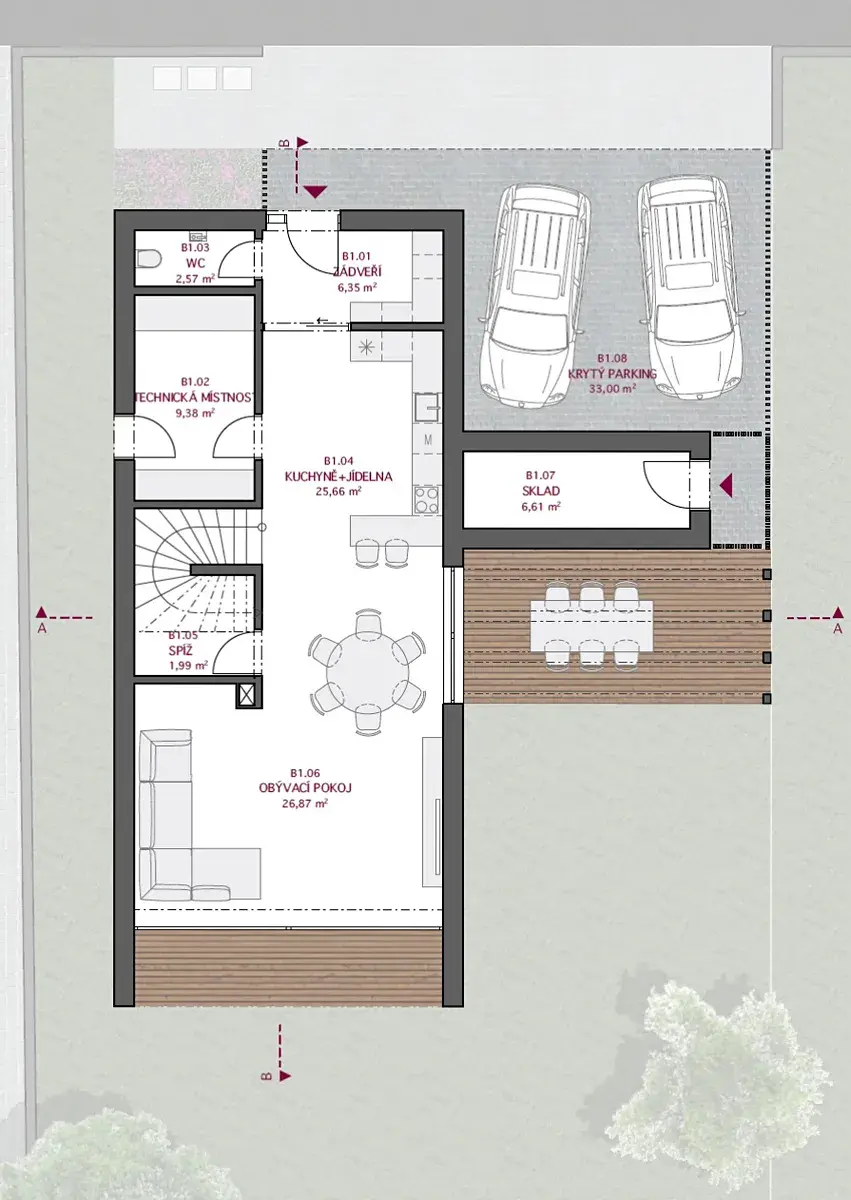 Exteriér domu je dán projektem (tvar, materiály, okna), vnitřní dispozice a standard interiéru jsou na volbě kupujícího. Cílem je zachování kvalitního a klidného charakteru lokality.