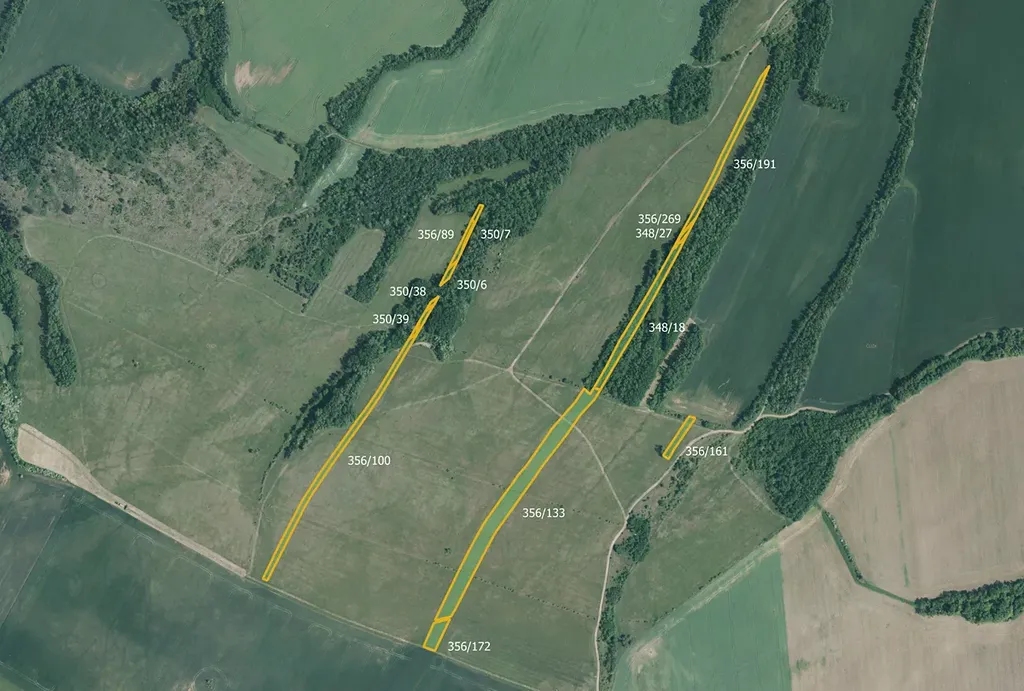 Předmětem prodeje je vlastnictví na celkem 14 parcelách zapsaných na LV 426 v KÚ Hrubšice.