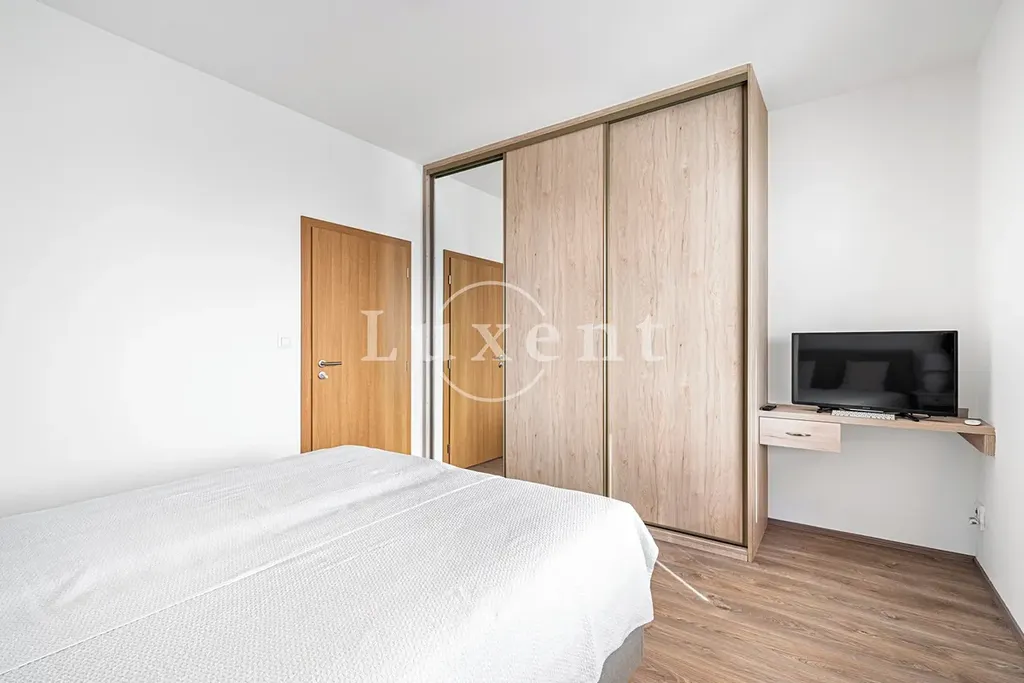 Byt se nachází v 6. nadzemním podlaží a jeho dispozice zahrnuje vstupní halu (7 m²), prostorný obývací pokoj s plně vybaveným kuchyňským koutem (31,8 m²), ložnici s vestavěnou šatní skříní (14,6 m²), praktickou komoru (2,6 m²) a koupelnu s WC (5,9 m²), která je vybavena vanou, topným tělesem a místem pro pračku. Z obývacího pokoje je vstup na velkorysou, částečně zastřešenou terasu (20 m²), která nabízí krásné výhledy do okolí. K bytu náleží také sklep a jedno garážové stání.