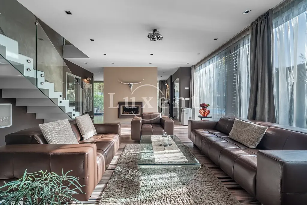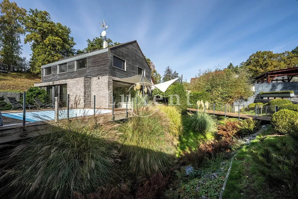 Nabízíme k prodeji dvojpodlažní rodinný dům 5+kk s celkovou užitnou plochou 185 m², který byl postaven v roce 2011. Dům představuje architektonicky nápaditě řešené moderní bydlení, které je citlivě zasazené do malebné okolní přírody Hrusic. Jihovýchodně orientovaná vila důmyslně pracuje se všemi živly: vodu představuje venkovní bazén a potůček na pozemku, rozlehlá zahrada poskytuje zemi, vzduch proudí velkými okny a dveřmi, oheň je zkrocen v krbu.