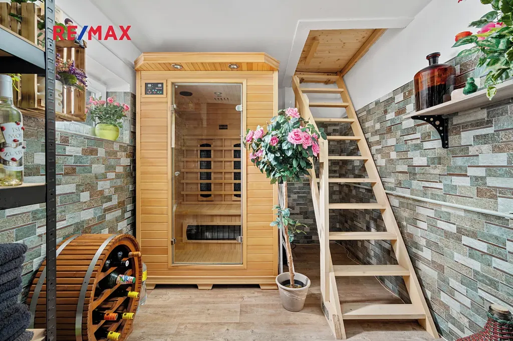 Dům má celkem 2 koupelny, je částečně podsklepený a nabízí i přístup na půdu z dílny a zadní místnosti se saunou.