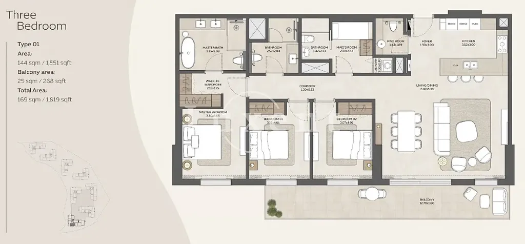 Apartmán nabízí celkovou plochu přibližně 169 m² (1 819 sq ft), z toho obytná plocha 144 m² (1 551 sq ft) plus prostorný balkon 25 m² (268 sq ft). Dispozice zahrnuje master ložnici s šatnou a vlastní koupelnou s vanou, dvě další ložnice (každá s vlastní koupelnou), samostatnou maids room s přilehlou koupelnou, elegantní obývací část propojenou s jídelnou, plně vybavenou kuchyni s ostrůvkem, prádelnu, hostovskou toaletu (powder room), vstupní foyer a dlouhou chodbu – vše navrženo s maximálním důrazem na prostor, přirozené světlo, plynulé linie a rodinný komfort.