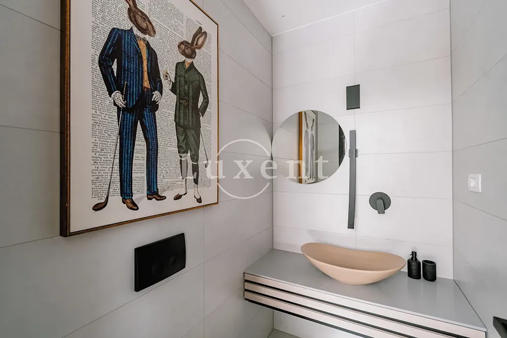 Nemovitost disponuje vybavenou kuchyní, jídelnou a prostorným obývacím pokojem s průchodem na velkou terasu s bazénem. V druhém podlaží jsou čtyři ložnice s balkony a tří koupelny. K vile náleží upravený dvůr s grilem a barem, sauna a parkovací stání na pozemku.
