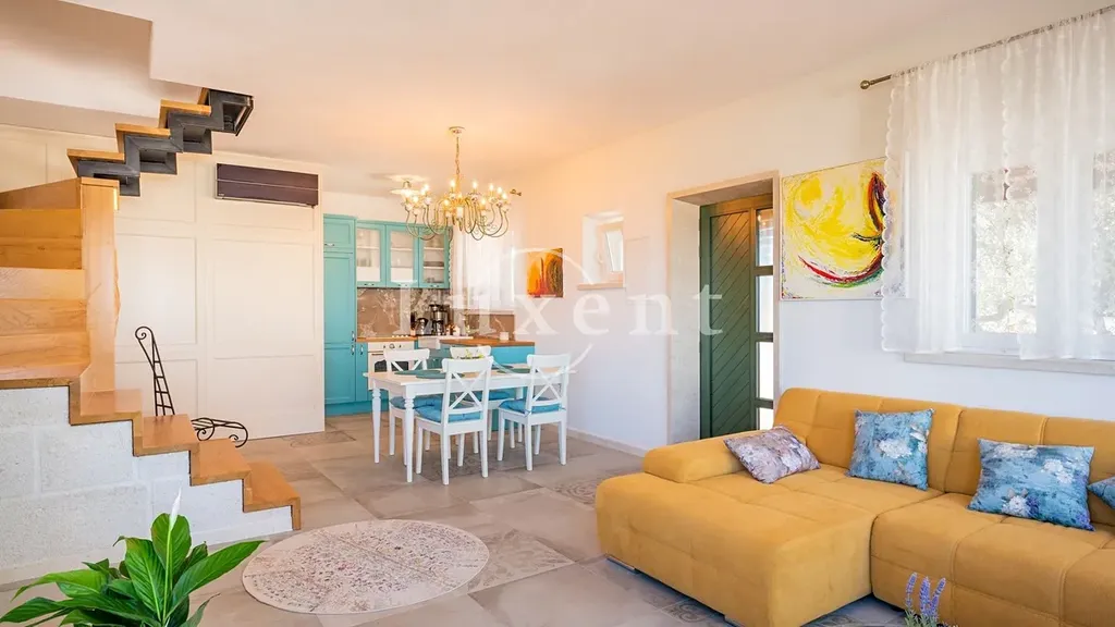 V horním patře se nacházejí dvě elegantně zařízené ložnice a moderní koupelna, která je vybavena hydromasážní vanou. Interiér je navržen s důrazem na detail, spojující moderní prvky s tradičním dalmatským stylem, což poskytuje maximální komfort a potěšení.