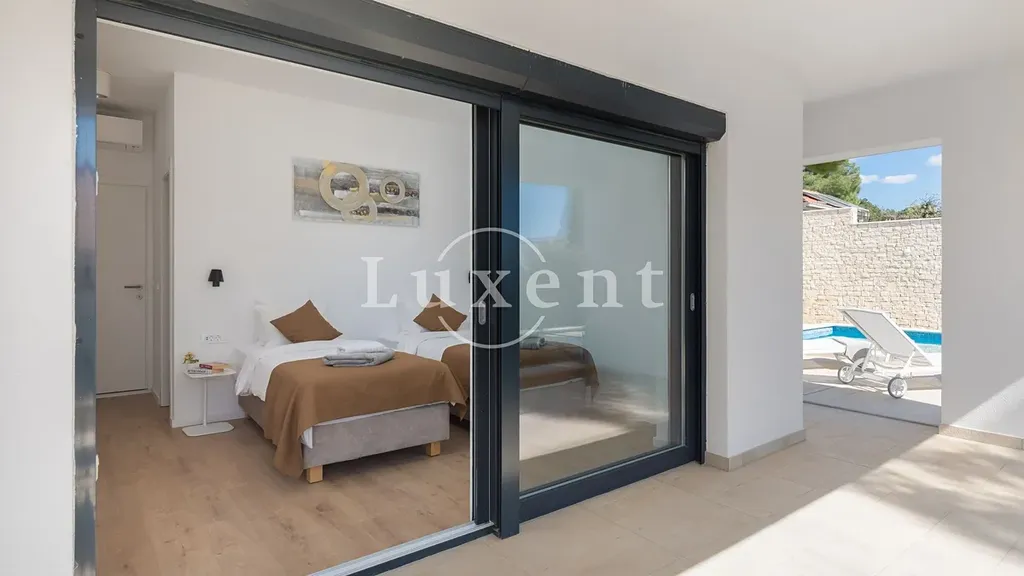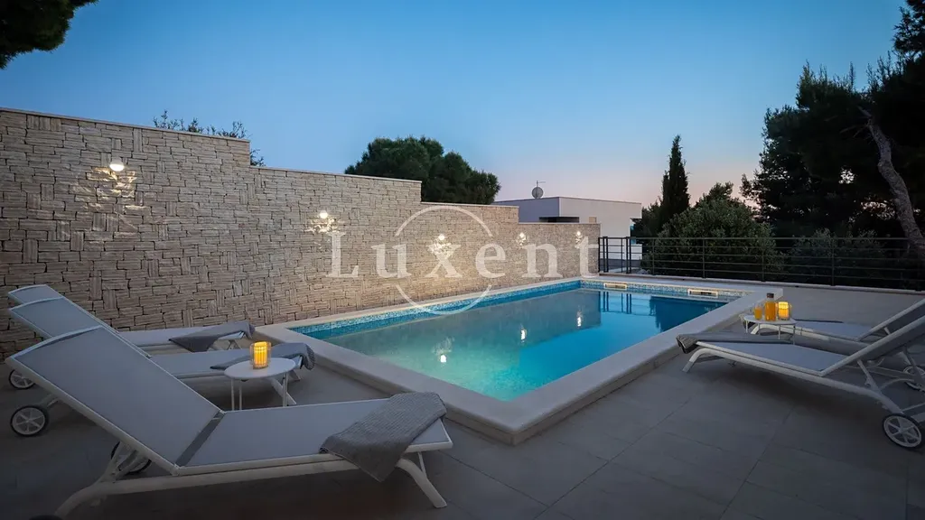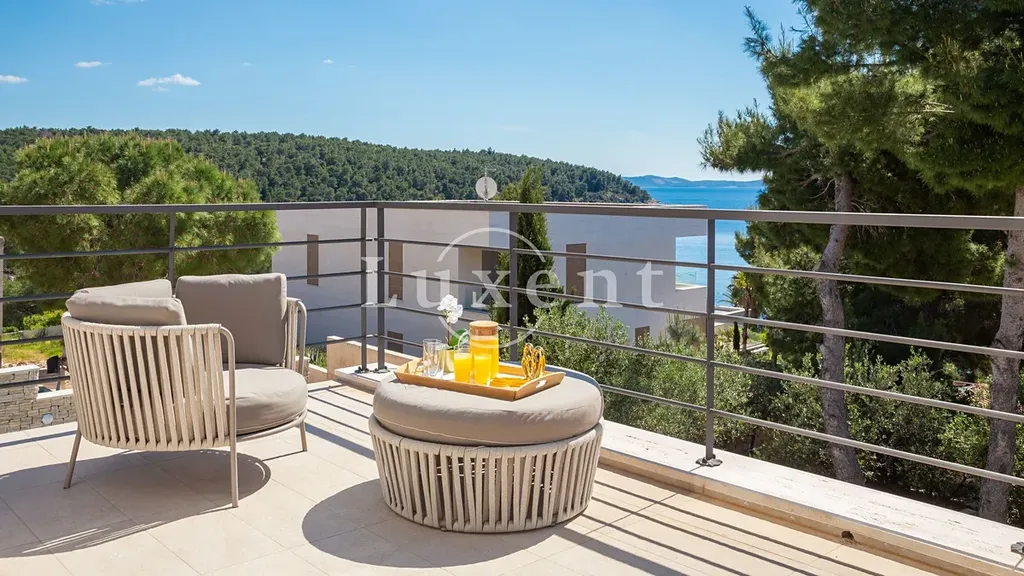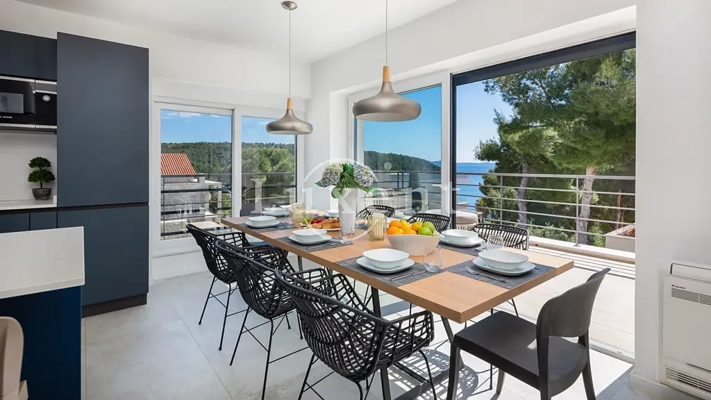 Nabízíme k prodeji krásnou moderní vilu situovanou v klidné zátoce na ostrově Brač, jen 5 minut jízdy od malebného přístavu Milna. Tato elegantní nemovitost se nachází ve druhé řadě od moře a pouhých pár minut chůze od pláže, díky čemuž nabízí ideální kombinaci soukromí, výhledu na moře a snadného přístupu k pobřeží.