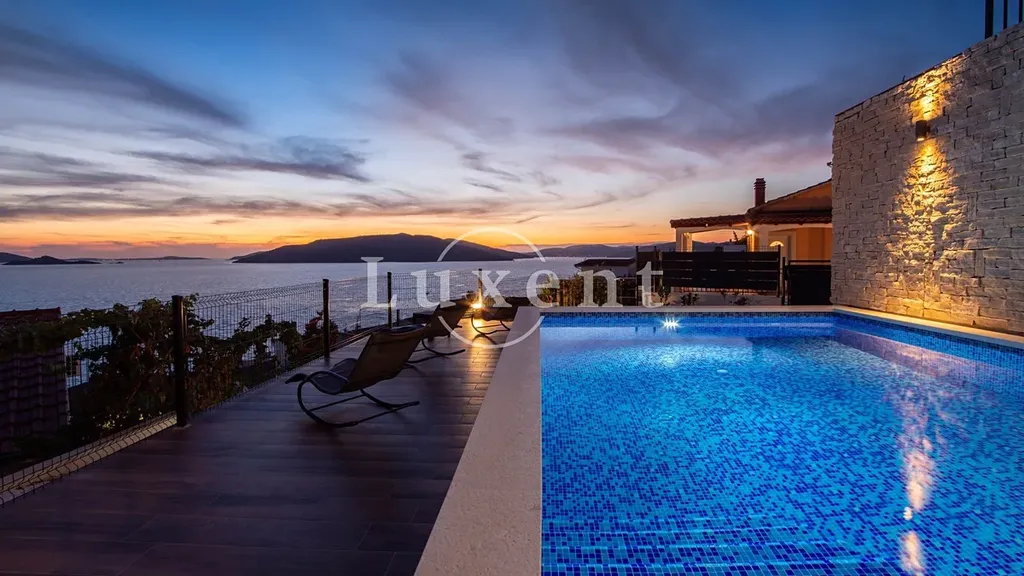 V přízemí vily se nachází wellness zóna se saunou, vířivkou a přímým vstupem k velkému vyhřívanému bazénu o rozloze 33 m2, který je obklopen prostornou sluneční terasou a zelení. Druhé podlaží nabízí komfortní ložnici s vlastní koupelnou, plně vybavenou kuchyň s jídelním koutem a prostorný obývací pokoj. Z něj se francouzskými okny vstupuje na venkovní terasu, odkud se otevírá úchvatný panoramatický výhled na moře a okolní přírodu. Třetí podlaží je navrženo jako klidová zóna se čtyřmi samostatnými ložnicemi, každá s vlastní koupelnou, což zajišťuje absolutní pohodlí pro větší rodinu nebo skupinu hostů.