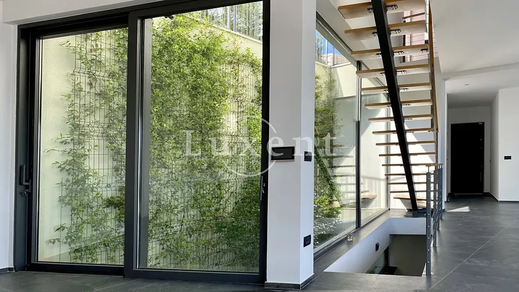 Vnitřní schodiště vede do horního patra, kde jsou čtyři prostorné ložnice a tři koupelny. Každý pokoj je navržen tak, aby nabízel maximální komfort a soukromí. V podzemní části se nachází další koupelna a multifunkční prostor, který lze využít jako fitness, vinárnu nebo domácí wellness. V pečlivě upravené zahradě je k dispozici garážové stání pro jedno vozidlo.