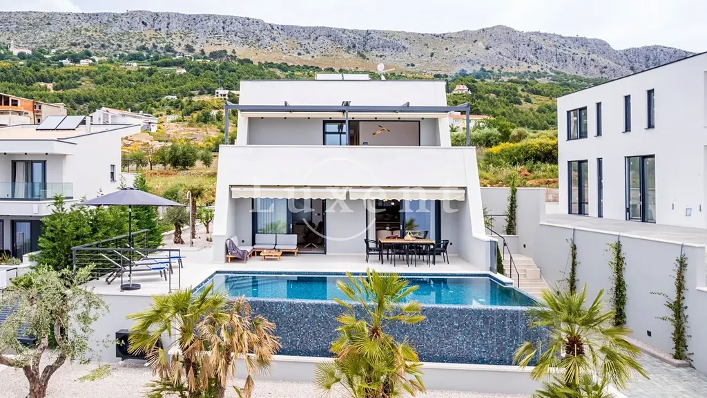 Nabízíme k prodeji moderní vilu s bazénem, která se nachází v unikátním komplexu nově postavených vil v osadě nedaleko města Split. Celková obytná plocha vily činí 320 m2 a je rozdělena do tří podlaží. V každém patře je umístěno několik lodžií a teras, z nichž si můžete vychutnávat úchvatný výhled na moře a okolní ostrovy. Vila se rozkládá na pozemku o rozloze 600 m2 a nabízí krásně upravenou zahradu s automatickým zavlažováním a parkovištěm pro několik vozidel.