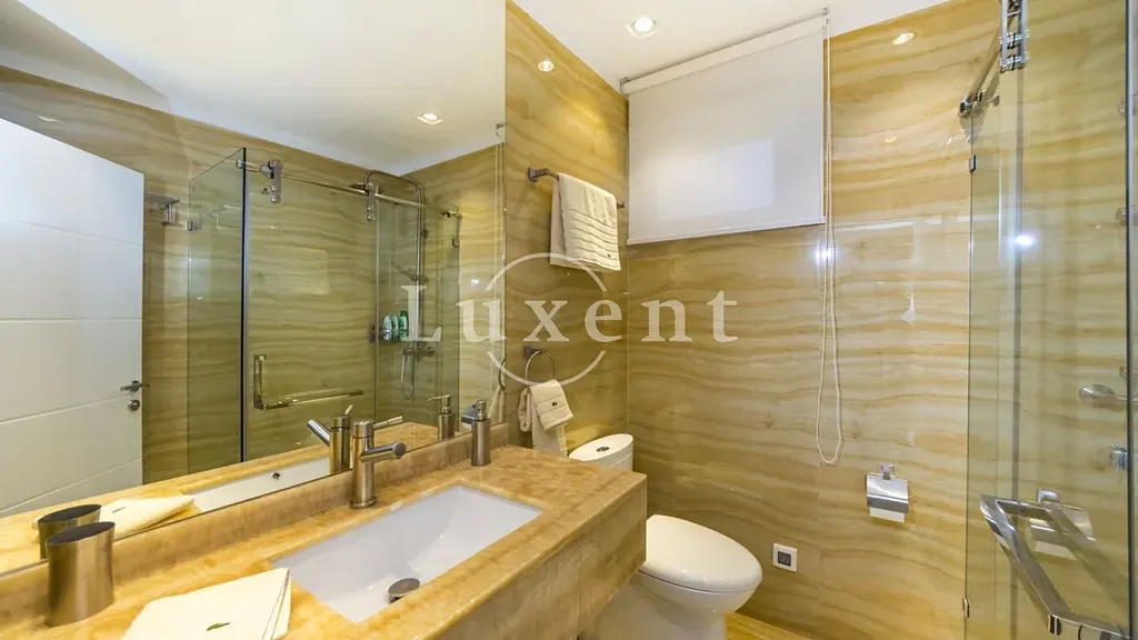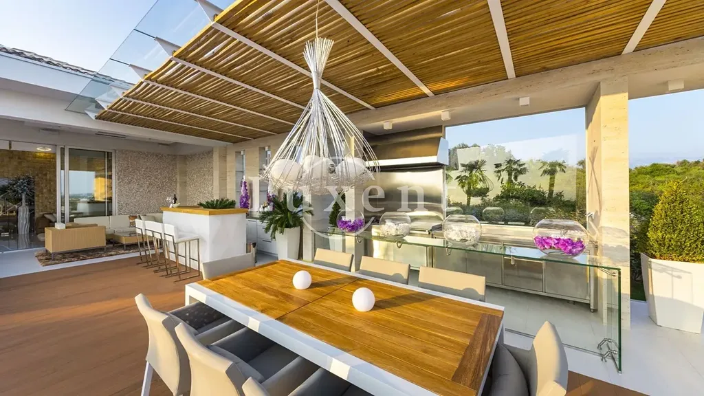 Dominantou venkovního prostoru je velký vyhřívaný bazén o ploše 72 m2, obklopený zelení a zcela chráněný před pohledy zvenčí – ideální pro rodiny s dětmi i domácími mazlíčky. Součástí exteriéru je venkovní obývací pokoj s televizí, plně vybavený koktejlový bar, posilovna, sauna a vířivka – vše vytvořeno pro maximální relaxaci a komfort s důrazem na soukromí.