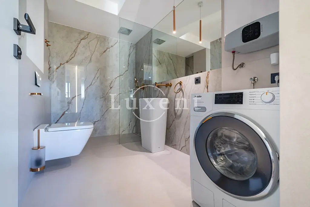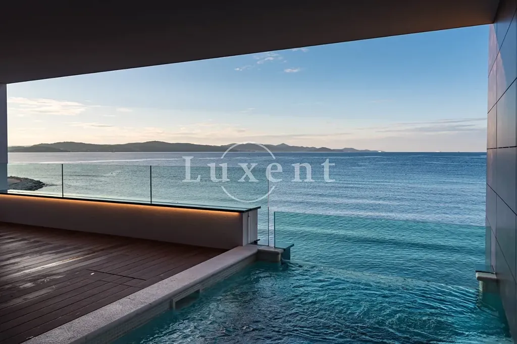 Apartmán o velkosti 144 m2 zahrnuje tři ložnice, otevřený obytný prostor s krbem, kuchyni a jídelnu, dvě koupelny, šatny, a vlastní wellness zónu. Dominantou je prostorná, slunná krytá terasa s bazénem, odkud se otevírá nádherný výhled na moře. Z této soukromé terasy vede přímý vstup na tichou, čistou oblázkovou pláž, která je vybavena venkovní toaletou, sprchou a pozvolným vstupem do moře.