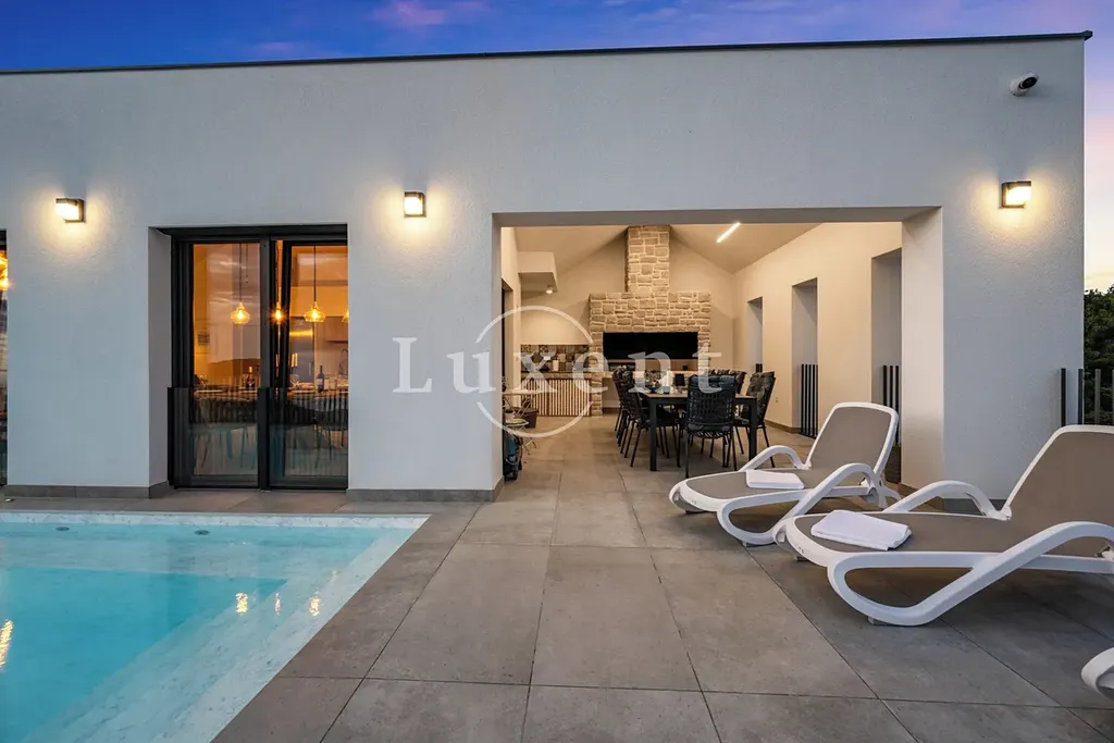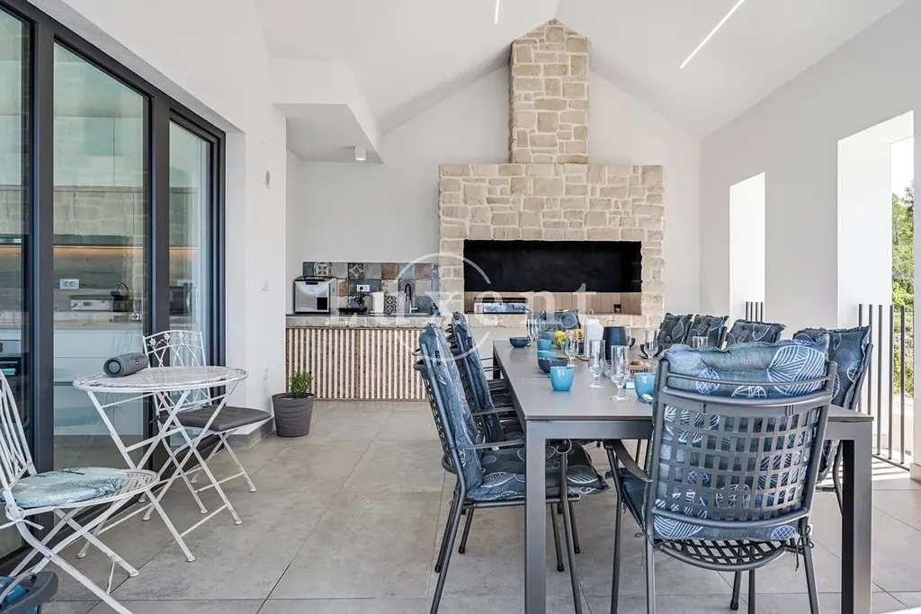 Venkovní část vily tvoří prostorná, oplocená terasa s vyhřívaným bazénem a dechberoucím výhledem na moře. K dispozici je rovněž kryté venkovní posezení s krbem a komfortním nábytkem, ideální pro letní večery.