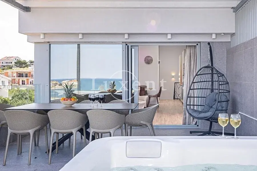 Druhé patro nabízí vzdušnou galerii přetvořenou na velkorysý obývací pokoj s přímým vstupem na terasu vybavenou soukromou vířivkou, ideální pro relaxaci při západech slunce nad Jaderským mořem.