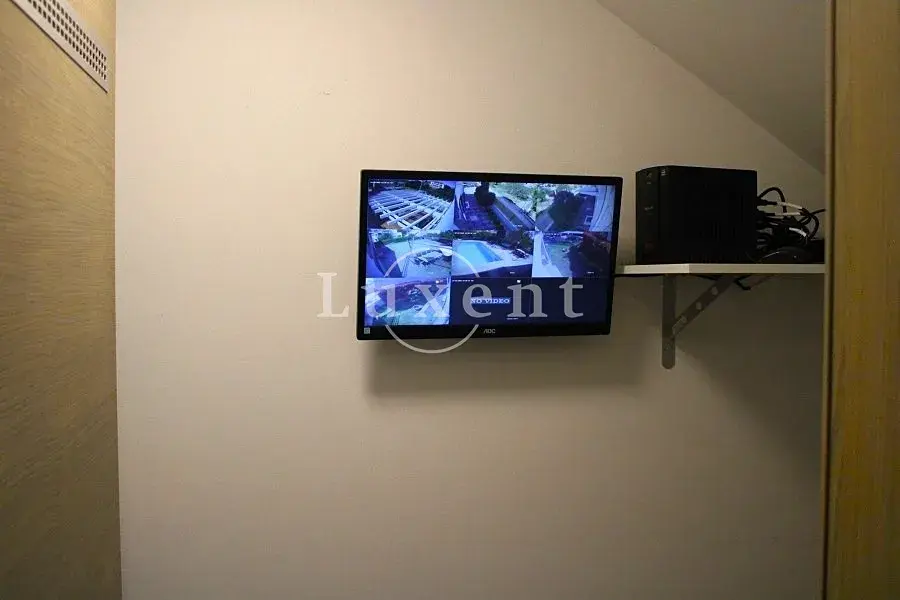 Vila nemá klasickou střechu, ale plochou terasu, na které jsou umístěny solární panely a venkovní jednotky klimatizace. Tento prostor lze po drobných úpravách využít jako relaxační zónu s úchvatným výhledem na moře a západy slunce, ideální pro meditaci nebo posezení při večerních panoramatech. Zahrada je centrálně orientována kolem vyhřívaného bazénu o ploše 31 m² a rozsáhlé sluneční terasy. Součástí venkovního prostoru je také grilovací zóna s krytým posezením a parkovací místo přímo u vstupu do vily.