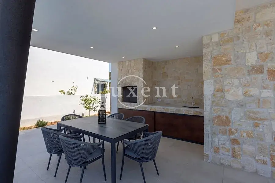 Exteriér vily dále zahrnuje venkovní gril s jídelním prostorem, ideální pro posezení a společenské aktivity. Součástí nemovitosti jsou tři parkovací místa a vila se prodává kompletně vybavená, připravená k okamžitému nastěhování či pronájmu.