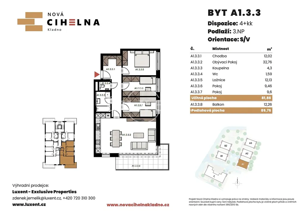 Nabízíme k prodeji byt 4+kk o podlahové ploše 85,75 m² s balkonem 12,26 m² v mimořádně úsporném developerském projektu Nová Cihelna Kladno vznikajícím v městské čtvrti Kladno – Rozdělov.