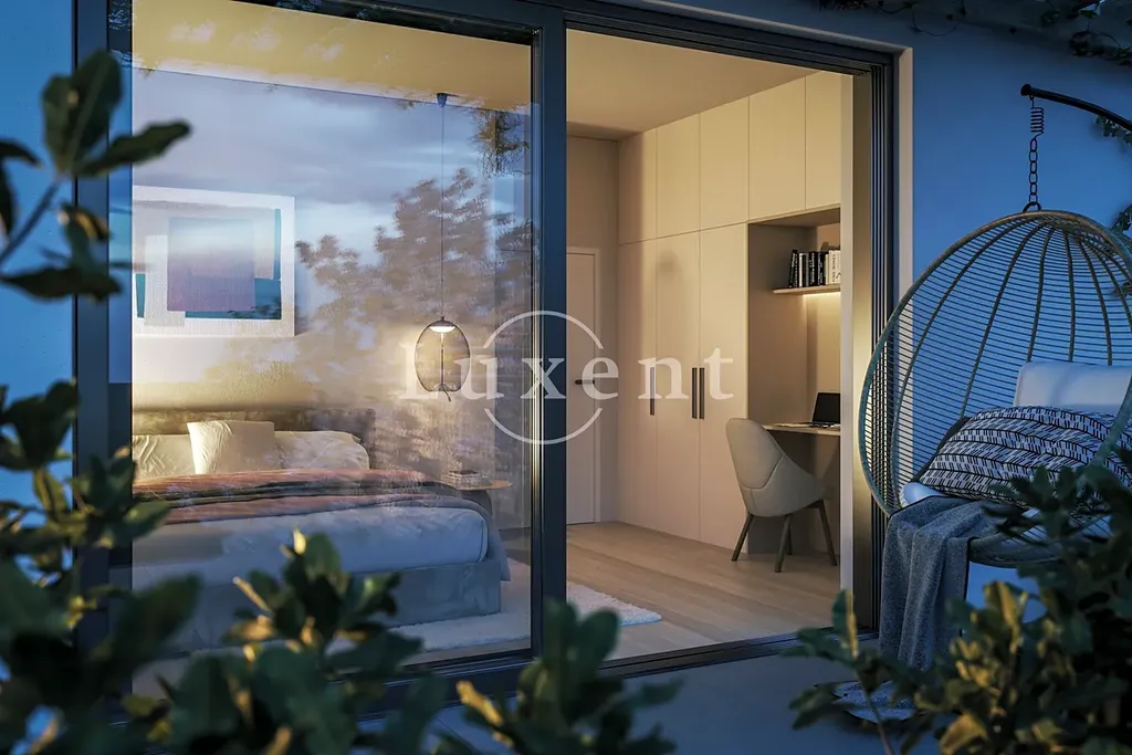 Byt je situován v 1. NP novostavby, interiér zahrnuje předsíň, prostorný obývací pokoj s kuchyňským koutem a jídelní částí, ložnici, další místnost, která může sloužit například jako pracovna, dětský pokoj či další ložnice, koupelnu s vanou a samostatnou toaletu. Z obývací části je vstup na zahradu s krásným výhledem do okolí. Byt je orientován na JZ stranu. K bytu náleží sklep a je zde možnost dokoupení garážového stání.